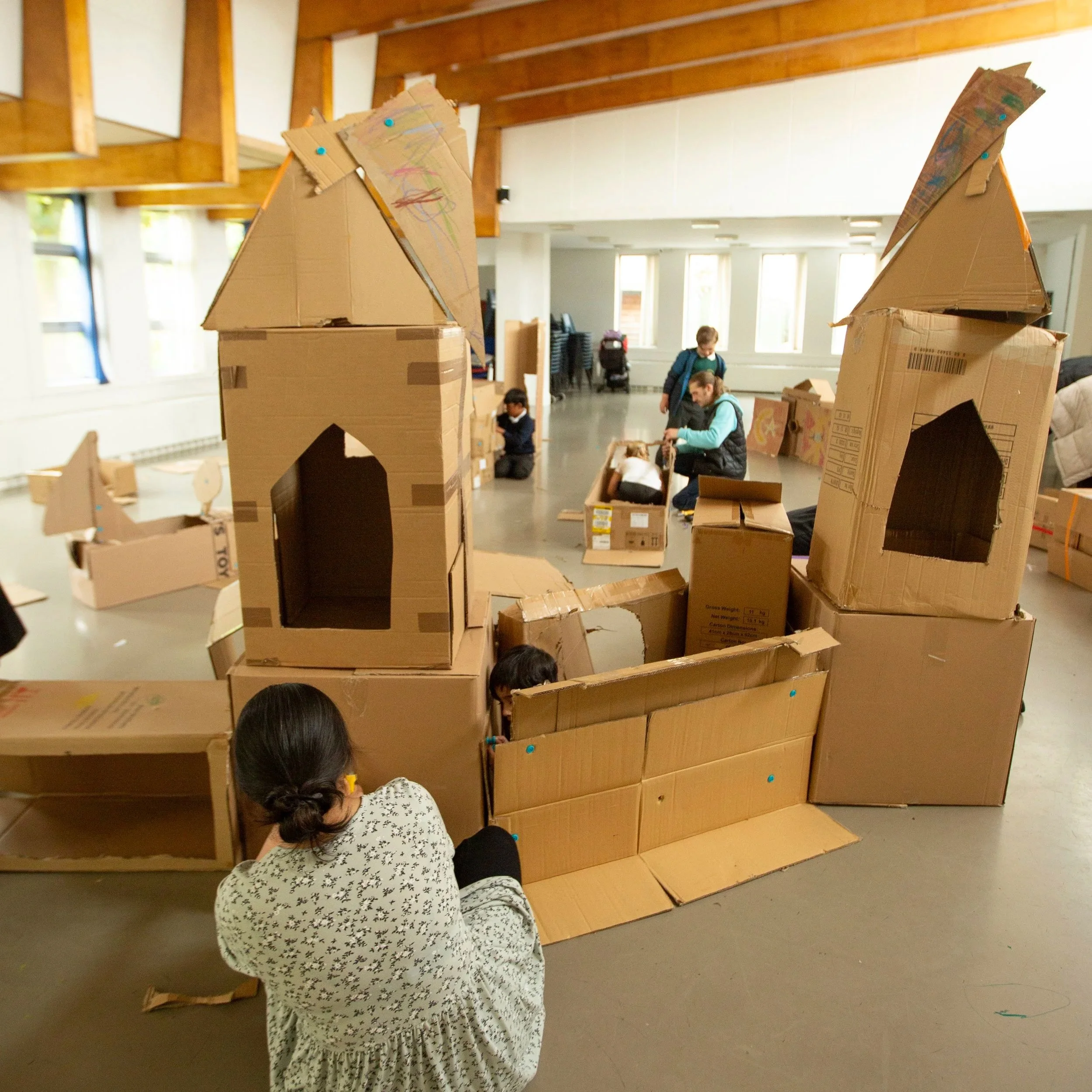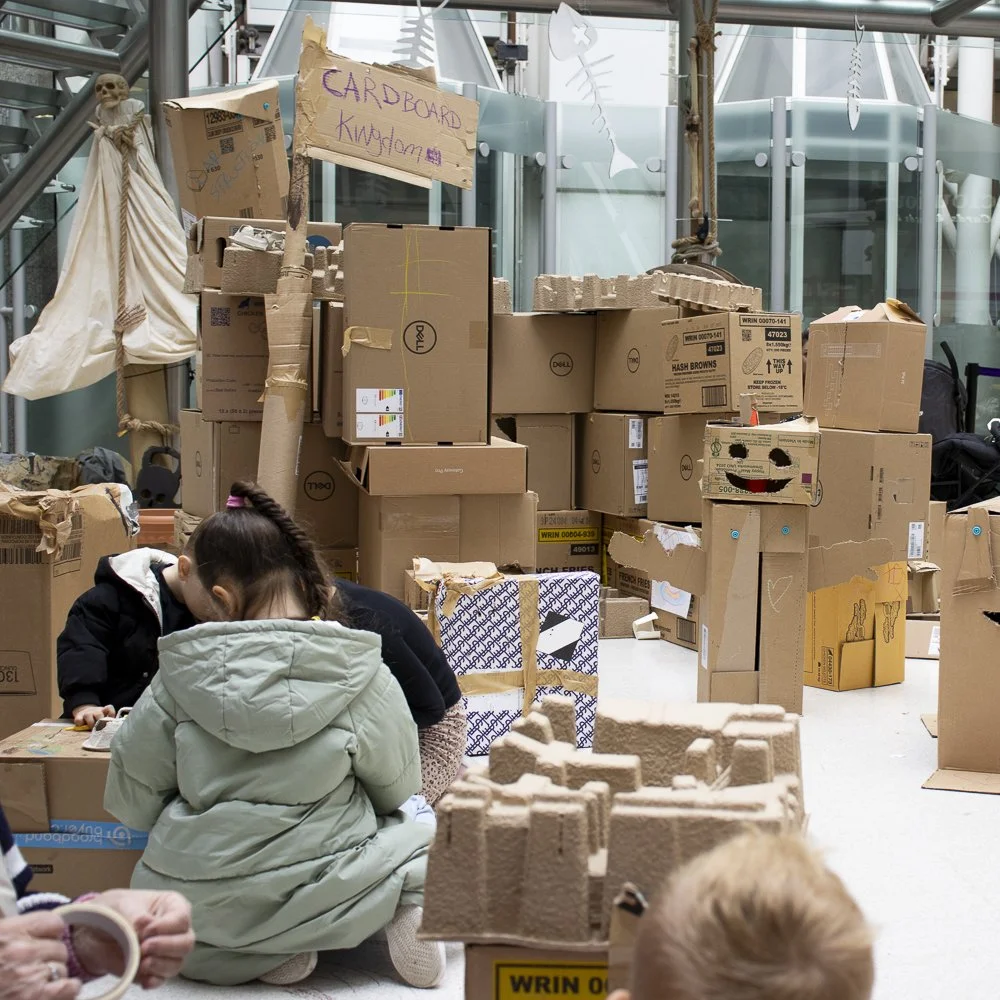This is an artist-led, open-ended creative experience. We demonstrate how to use the tools and facilitate participants' ideas. Everyone can build, colour, and decorate whatever they like out of cardboard to contribute to a collaborative cardboard kingdom.